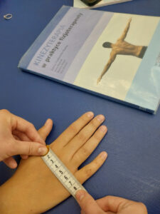 Słuchacze 1 technik masażysta podczas zajęć z pracowni fizjoterapii wykonują badania linijne długości i obwodów.